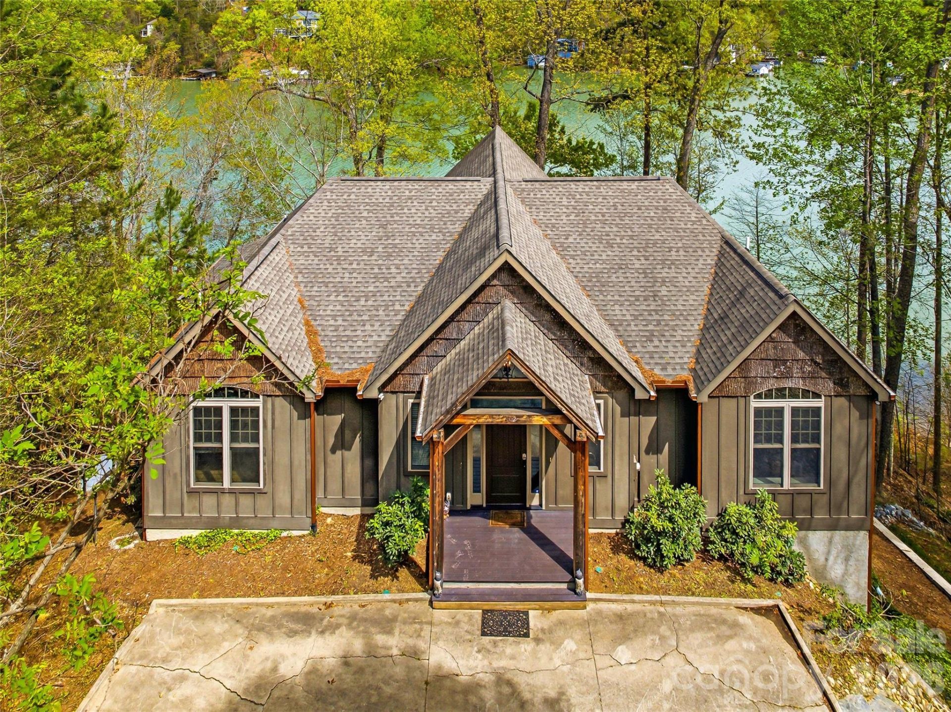 Builder's custom lakefront double lot retreat, showcasing mountain elegance in a private setting. Located on a deep water main channel in the Gated Community of Blue Heron Point on Lake Lure. Privacy abounds on this rare double lot with over 200 feet of shoreline. This property features a private beach, and an exceptional new boathouse with party deck above. Inside, the home is rich with warm wood finishes and thoughtful details, including post-and-timber exposed beams, tongue-and-groove cathedral ceilings, granite countertops, stainless steel appliances, and a striking stone fireplace. The split-bedroom floor plan enhances privacy, while double covered lakeside decks provide stunning views from multiple vantage points. The main level of the home offers an open-concept design connecting the living, dining, and kitchen areas?perfect for gathering and entertaining. The spacious primary suite, complete with a large private bath and walk-in closet, is thoughtfully positioned for privacy, while two guest bedrooms with a Jack-and-Jill bath are located on the opposite side of the home. The lower level expands your living space with a generous family room, full bath, bunk room, and game room, all opening to the lakeside mountain views and deck. Two additional unfinished rooms currently used for game room and storage provide excellent potential for expansion?ideal for a home office or additional bedrooms. Step outside to enjoy true lakefront living. The lower deck leads directly to the hot tub area then down to the boathouse and waterfront, where you can swim, fish, or relax on your private beach. The boathouse is among the finest on Lake Lure, featuring double slips with barn-door access, covered outdoor living space, side docks for paddleboards, and a screened upper-level porch perfect for lounging or entertaining. This very private property offers the perfect blend of luxury, comfort, and natural beauty?an ideal full-time residence or mountain lake retreat on the main channel of Lake Lure.