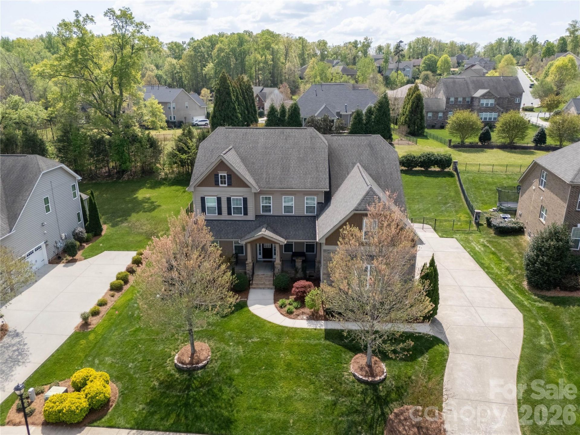 Elegance, scale, and thoughtful design converge in this exceptional six-bedroom residence, where refined finishes and expansive living spaces create a home that is both impressive and inviting.From the moment you arrive, the home's stately presence is undeniable?featuring cement fiber board construction, stacked stone accents, a side-load three-car garage with turnaround pad, and a classic rocking chair front porch that sets the tone for what awaits inside.Step through the glass entry door, framed by transom and sidelights, into a grand foyer adorned with rich hardwood floors, intricate crown molding, chair rail, and wainscoting?an introduction to the craftsmanship carried throughout the home.Flanking the foyer, a formal dining room and private office offer both elegance and functionality, each finished with detailed millwork, designer lighting, and warm hardwoods.At the heart of the home, the great room is both sophisticated and comfortable, featuring a gas fireplace with mantle, surround sound, and ambient recessed lighting. It flows effortlessly into the breakfast area and a chef's kitchen designed to impress.The kitchen is a true centerpiece?appointed with granite countertops, an oversized island with seating, custom 42-inch cabinetry with crown detailing and pull-outs, subway tile backsplash, double ovens, gas cooktop, and under-cabinet lighting. A butler's pantry and walk-in pantry enhance both form and function, while a dedicated home management center and drop zone add everyday convenience.A main-level guest suite with private bath provides ideal accommodations for visitors, offering both privacy and comfort.Upstairs, a spacious loft filled with natural light creates a versatile living space, while the owner's retreat redefines luxury living. This expansive suite features a tray ceiling, serene sitting space, and an extraordinary THREE walk-in closets. The spa-inspired bath offers a corner soaking tub, a beautifully tiled shower with bench, dual oversized vanities with granite tops, and a private water closet.Additional accommodations include a private en-suite bedroom, generously sized secondary bedrooms, a shared bath with dual vanities, and a flexible bonus room?perfect for a media space, fitness room, or additional bedroom.Outdoor living is equally captivating. A Sunspace window-enclosed three-season room with tongue-and-groove ceiling and ceiling fan transforms effortlessly as oversized Sunspace windows open to create a screened retreat. Beyond, a deck and extended patio overlook a beautifully fenced backyard with sleek black aluminum fencing?ideal for both entertaining and quiet evenings at home.Every detail of this home has been thoughtfully designed to offer a seamless blend of luxury, comfort, and functionality?creating a residence that truly stands apart.6 Bedrooms | Office | Loft | 4 Full Baths | 1 Half Bath | 3-Car GarageNote: Whole-house water filtration system does not convey but may be negotiable with th